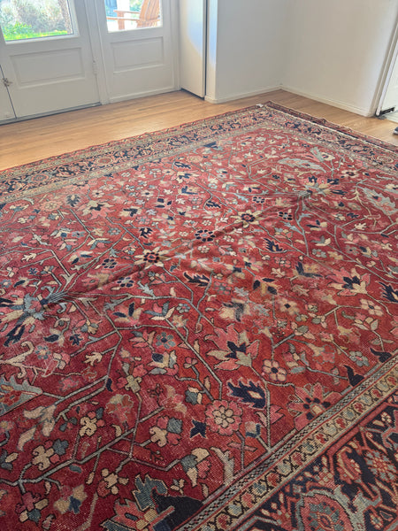 Floral and fiery with some worn-in charm, this antique Persian Heriz is brimming with personality. It hums with energy, while the highly stylized all over design throws a garden party with decorative motifs, each one more delightful the closer you look.