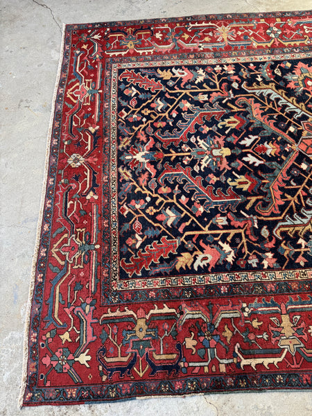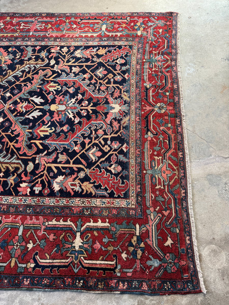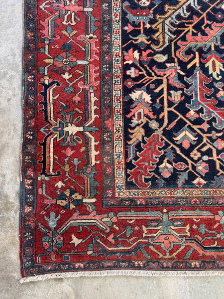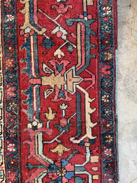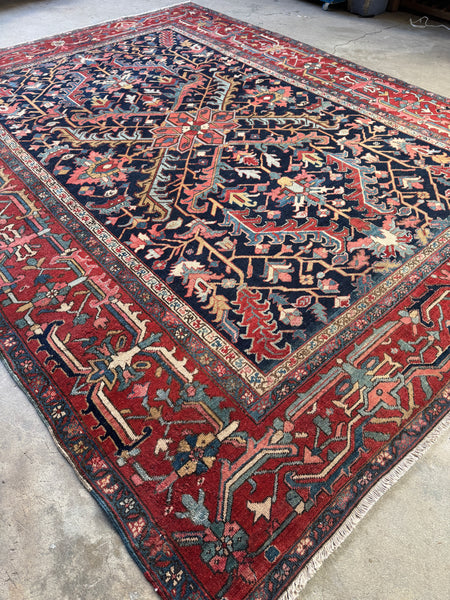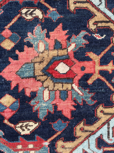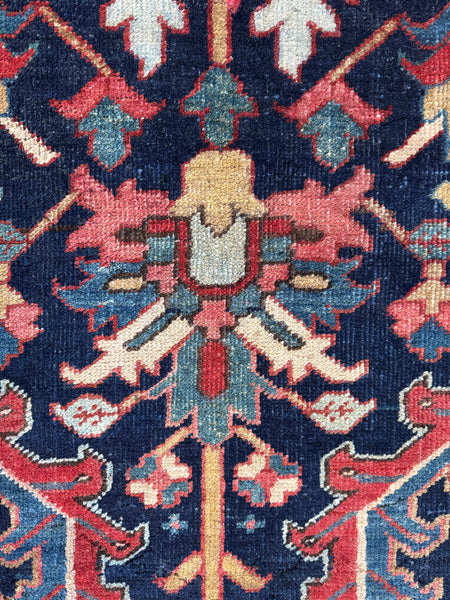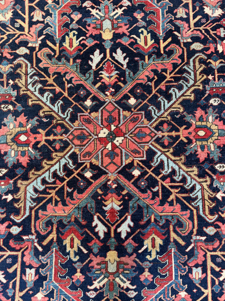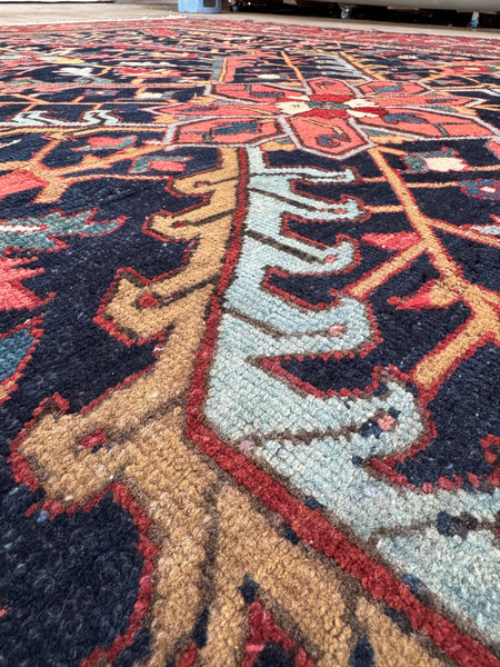 The color story is unreal and beautifully layered…deep navy paired with brick red, rust, deep blush, coral, sage green, sky, ice, aqua and teal blues, warm camel, tan, and soft ivory. All vegetable dyed wool, mellowed and settled after a century of life, giving the colors that rare, lived-in harmony you just can’t fake. The wide red rust borders are especially striking, grounding the composition and giving the rug that palatial Heriz presence that fills a room without overpowering it.