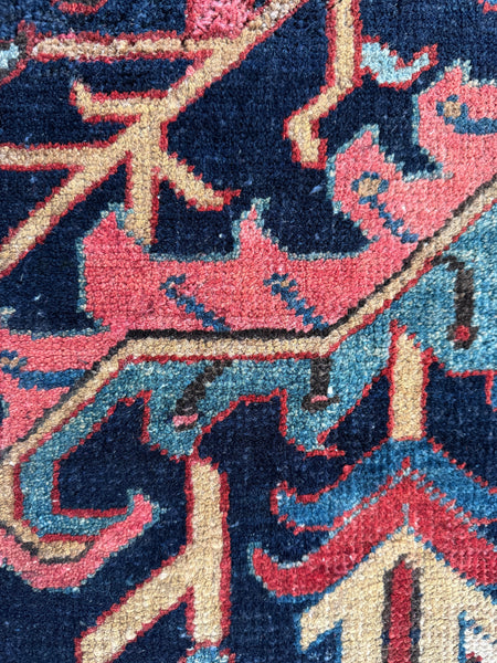 This navy blue Heriz is a true standout…one of those rugs that instantly shifts the energy of a room and makes everything around it feel more intentional. The field is saturated and moody, setting the stage for powerful, angular geometry that feels architectural and deeply rooted in tribal Persian art. Heriz rugs are known for their strength and graphic presence, but this one pushes further…art that feels fearless, expressive, and slightly unexpected. The central medallion is commanding and rhythmic, branching outward like a living form, almost electric against that dark, inky navy ground.