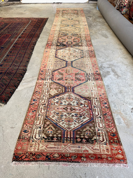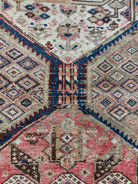 Meet a beauty from Northwest Persia…a narrow Gharajeh runner that’s got personality for days. This old-world charmer is all about those eight poled medallions marching down the field, each one rocking its own design and color combo like a lineup of mini masterpieces. Peek closer and you’ll spot little tribal surprises…people, critters, and tiny figures we believe the women who wove this added in as a quiet signature. Love that.