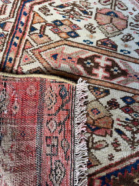 The border shows off an ivory caterpillar chain and seeds of life motifs, adding movement and story all the way through. The palette is soft, serene, and in nice condition. The original dyes were gently mellowed through a compound wash, giving this runner that creamy, subdued vibe designers and home owners alike, drool over. Think easy neutrals with touches of shell pink, cocoa, sky blue, and earthy notes… plus gorgeous abrash from the dyed wool that shifts like watercolors.
