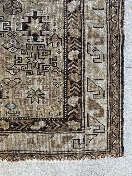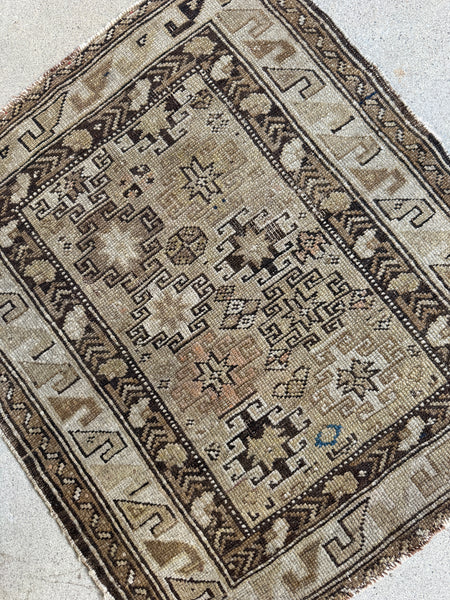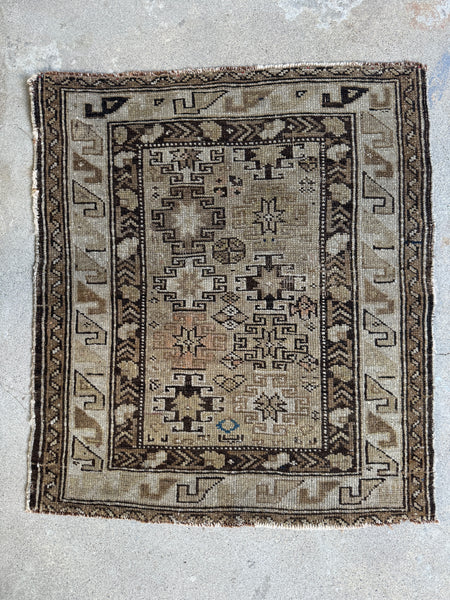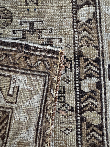 The graphic geometry is classic Caucasian, with strong, angular motifs and symbolic forms arranged in a rhythmic, almost architectural layout. The palette is restrained and earthy…sand, stone, warm browns, inky accents, with traces of softened natural dyes peeking through. Everything feels beautifully settled, calm, and intentional.