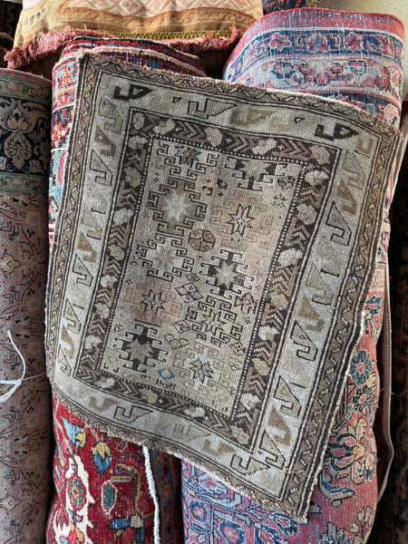 This tiny antique rug from weavers of the Caucasus mountains may be small in scale, but it carries serious presence. It's old and has a lot of history.