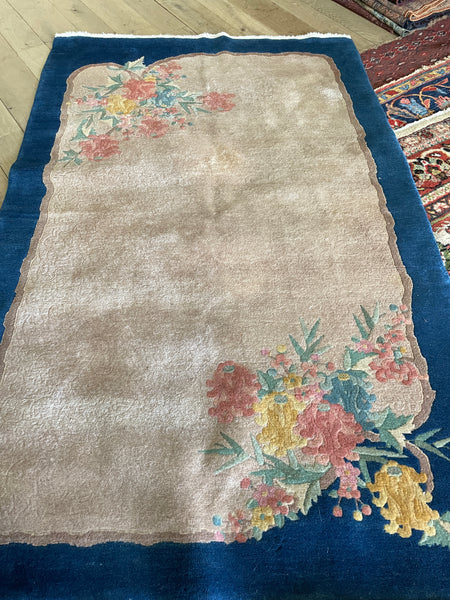 This exceptional antique Chinese rug showcases a robust construction, adorned with an open field design graced by intricate floral artwork in the corners. Encased within an exquisite blue frame.