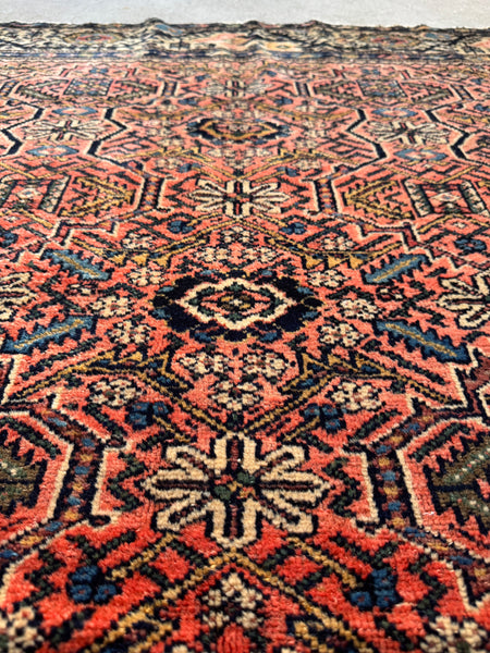 Handwoven with vegetable-dyed wool, this Malayer is more than a decorative rug, it’s a highly detailed piece of floor art that will be cherished. Between the luminous border, the mesmerizing all-over field, the awesome square shape and the nuanced palette, it offers endless design vocabulary and stands as a testament to Persian village weaving at its best.