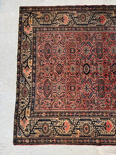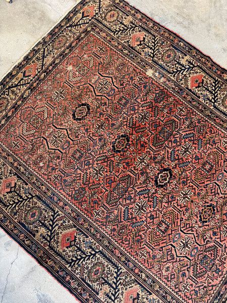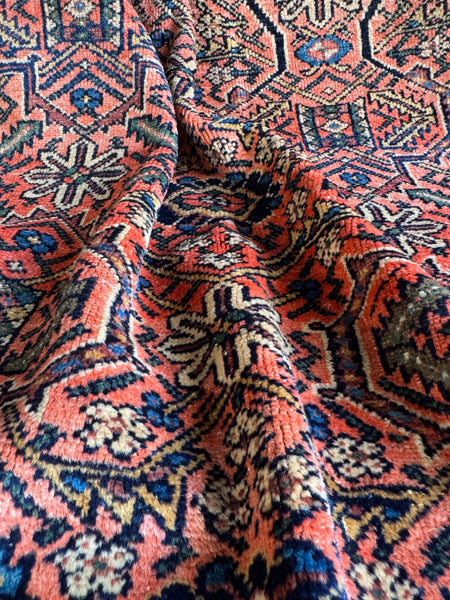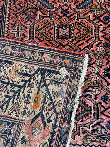 This antique Persian Malayer from the 1920s, measuring a square-ish 5x6, showcases art that pulls you in the longer you look. At first glance, it’s the border that steals the show, an exquisite frame filled with branching vine and geometric floral motifs, almost like trees sprouting in rhythmic succession. The dark midnight blue tendrils against a warm wheat backdrop give the impression of movement, as if the border itself is alive and growing.