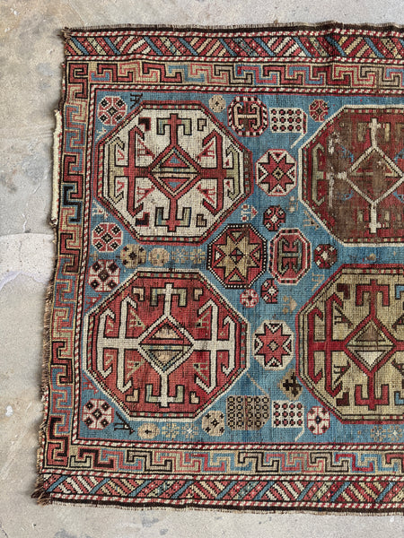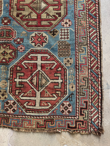 A time-worn antique Caucasian that carries all the grit and tribal strength collectors chase. Handwoven with 100% vegetable dyed wool, this piece shows off mellowed natural dyes that have softened beautifully over time. The field glows with a striking and rarely seen French blue ground full of abrash…that wonderful shifting of color that only old vegetable dyes can deliver. Across the surface are six large hexagonal medallions, each drawn with tribal energy. Between them, smaller motifs keep the eye dancing around the field.