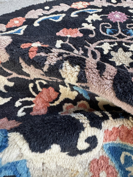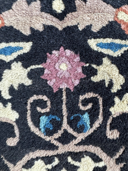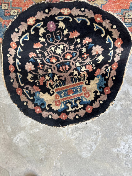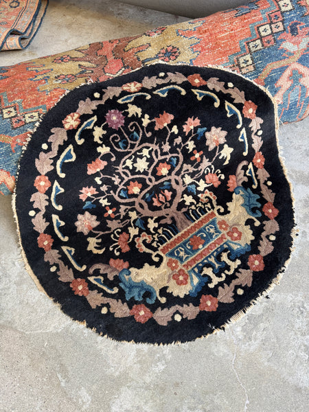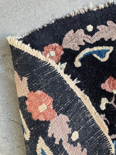 This petite round antique Chinese rug clocks in at about 2’5 and is a total jewel. From the 1890s, it features that unmistakable inky black ground paired with soft, dusty pastels that feel both graphic and romantic at the same time.