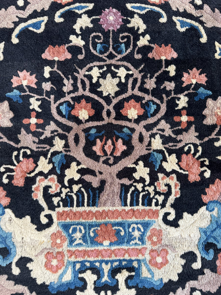 The design centers around a vase holding a blossoming tree, a classic Chinese motif symbolizing harmony, abundance, and life force. Surrounding florals float effortlessly, with gentle curves and scrolling vines that give the piece movement without feeling busy. The palette is especially pretty…muted rose, lavender, pale celadon, ivory, and hits of faded denim blue, all sitting beautifully against the dark field.