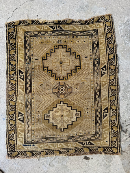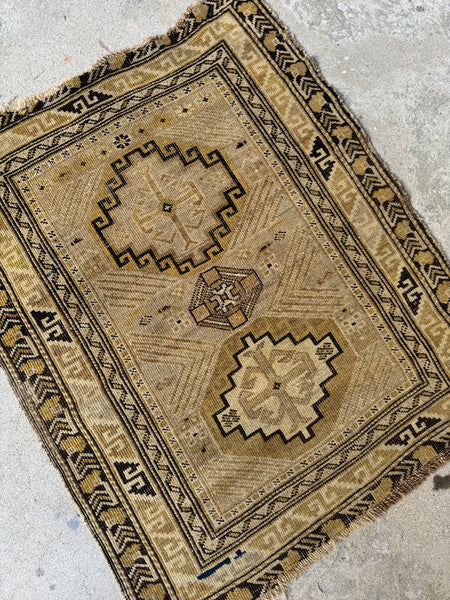 Ohhh this is the good kind of quiet. Small and mighty, a late 19th century Caucasian tribal scatter with that perfectly neutral and earthy palette. Soft wheaty golds, warm sand tones, deep espresso browns… all mellowed down into something earthy and easy. Based on lighting, she'll be more golden or warm or on the cooler side.
