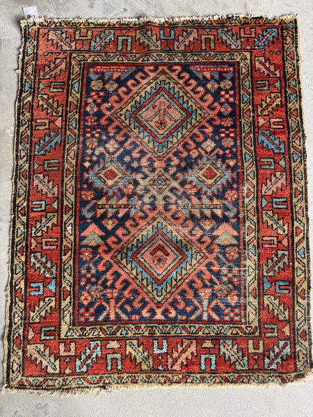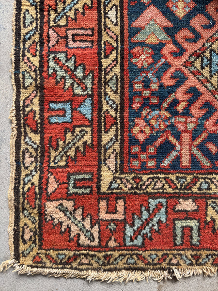 This little Persian packs a punch. Woven circa 1930 in Northwest Persia, this scatter rug is full of life, boasting bold natural dyes and that classic tribal geometry you see in its big brothers, the iconic Heriz rugs. Strong rectilinear motifs run through the field, showcasing handwoven village charm with every knot.