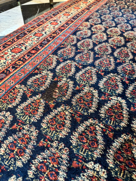 Lean. Long. And looking very confident stretched out across a hallway. This antique Persian Runner is a beauty with tightly spaced floral filled paisleys marching across a deep navy ground. It’s rich. It’s moody. It has that midnight garden energy that instantly dresses up a long and skinny hall.