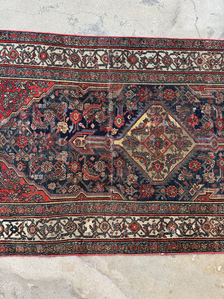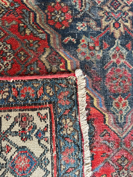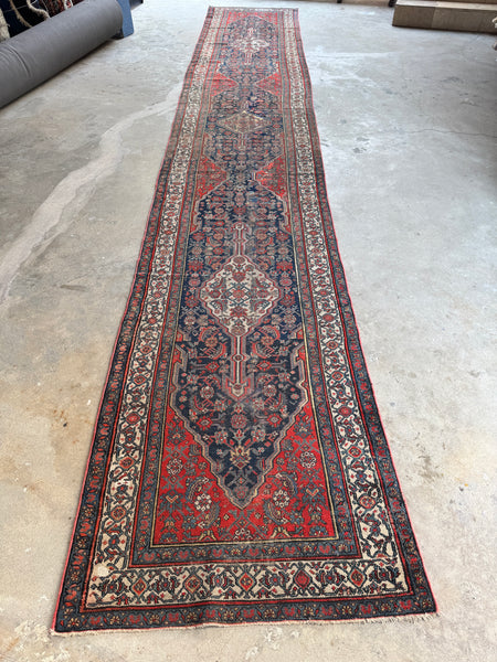 This antique Persian runner is a beauty…supremely long, tribal, and powerful in design. Medallion within medallion pattern run the length of the piece, filled with intricate Herati details against a navy blue and red ground that add richness and depth. An ivory border band with tribal elements frames it beautifully, balancing the dark and complex field inside.