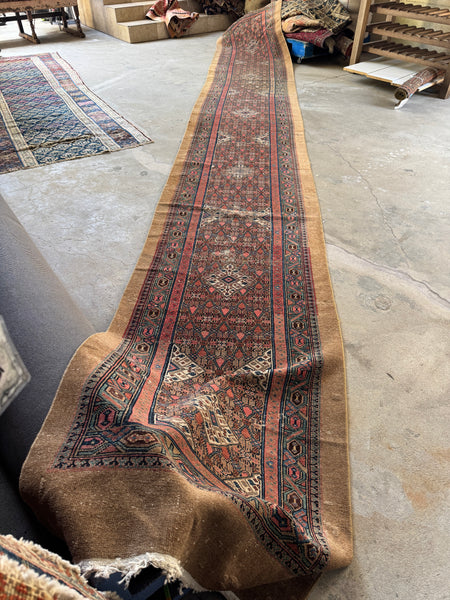 Here’s all the charm you’d want in a long, skinny piece. At 20 feet, it’s woven for those hallways that never seem to end, and its design makes the walk a lot more interesting. This antique Persian Seraband runner from the 1920s has vegetable dyed wool and it shows off an intricately decorated lattice pattern against a creamy mocha ground sprinkled with medallions that almost look like they’re floating.