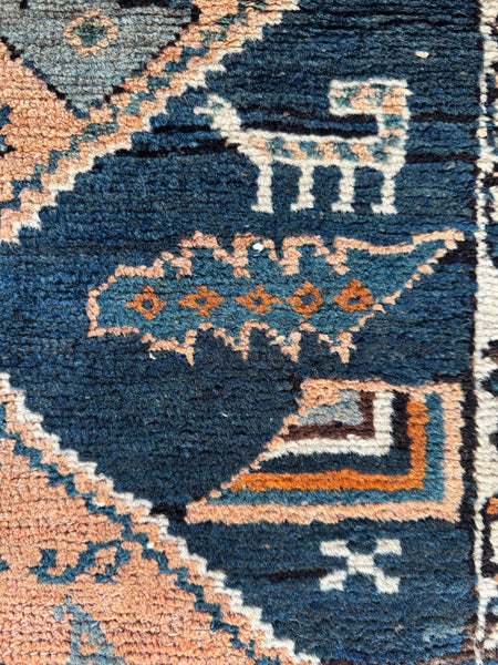 The field features a row of bold diamond medallions filled with stylized flowers and geometry, and scattered throughout you’ll spot serrated leaves, wine cup motifs, and even little animal figures, woven in for blessing, life, and protection. These playful details give the rug its soulful individuality.