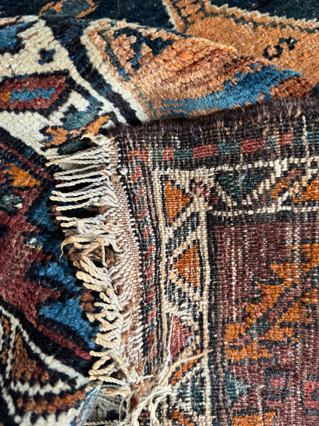 The colors are warm and rich…think madder brick, earthy rust, midnight indigo, and flashes of soft sky blue. All naturally vegetable-dyed, the wool has aged into a marbled, almost watercolor effect, with abrash that shifts tones across the runner like brushstrokes of time.