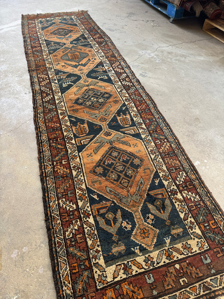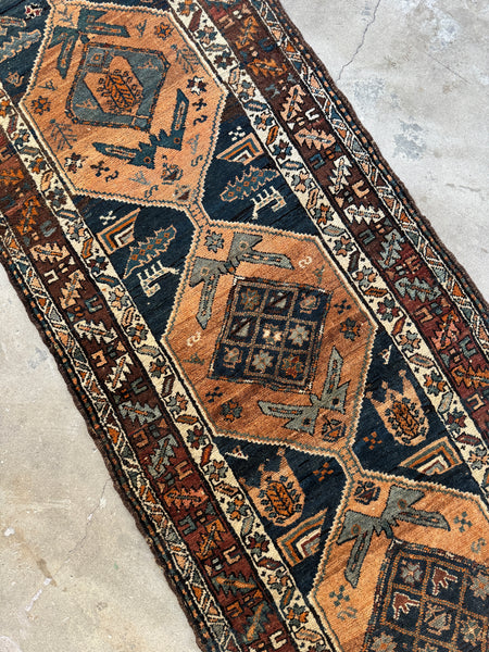 If you’re crushing on this runner, you’re not alone…it’s a tribal beauty with power, personality and presence. Woven in the 1920s in Persia, this high quality wool antique runner carries all the charm of handmade work, with variations in width (leaning 2’10 at its narrowest and stretching to 3’1 at the widest) that confirm its one-of-a-kind character.