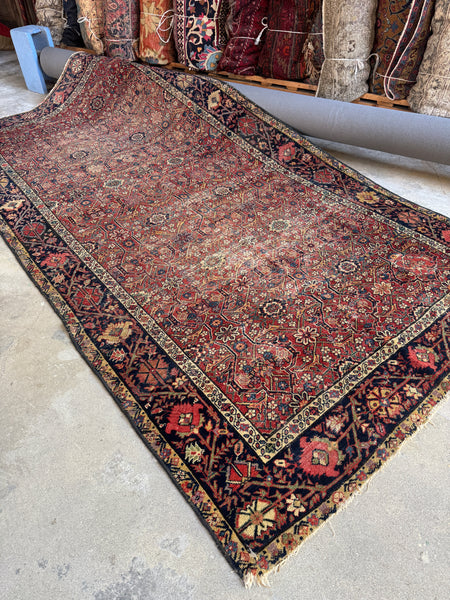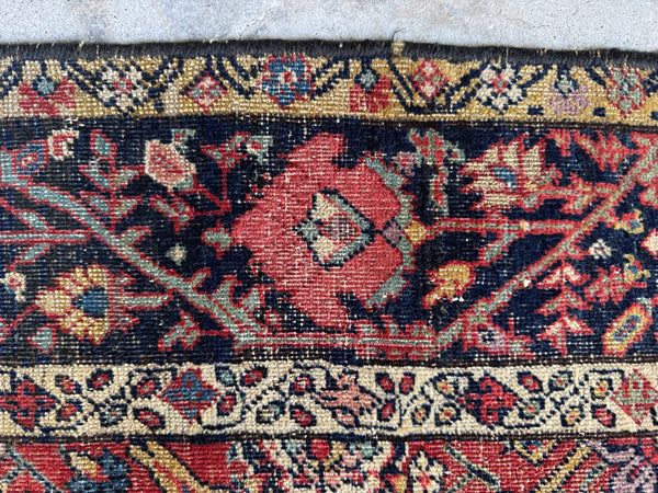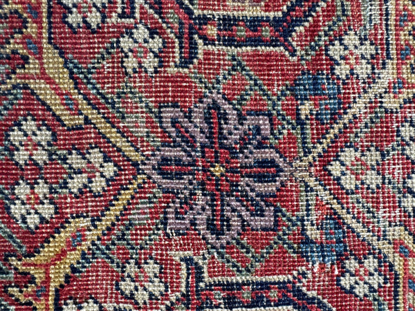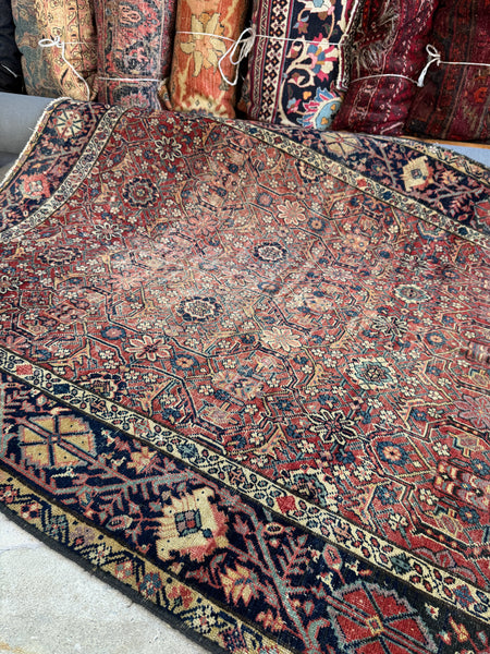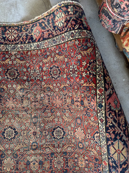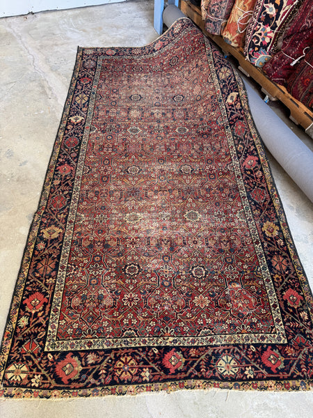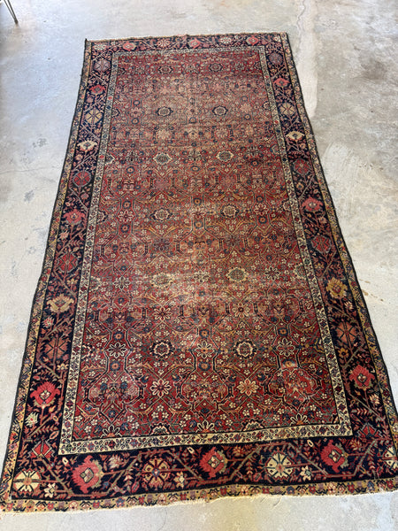 This rug shows its age in the best way. Low pile with scattered wear that reads as honest and soulful, not fragile. It’s fully intact, well woven, and has that reassuring weight underfoot that old village Persians are known for. Woven with all natural, vegetable dyed wool, it’s sturdy, grounded, and built to keep going.