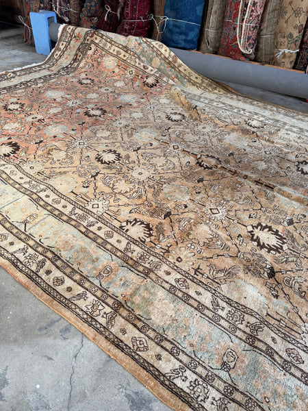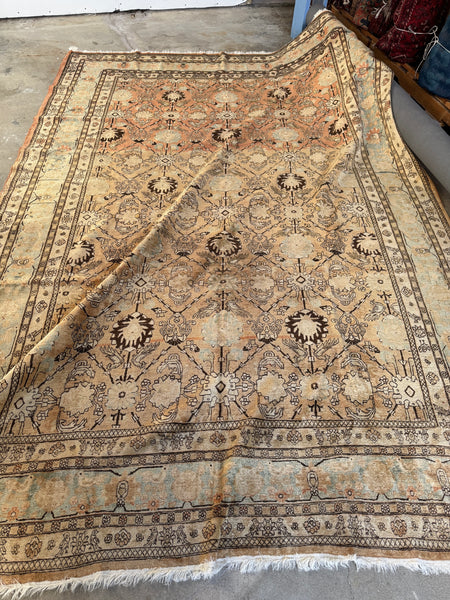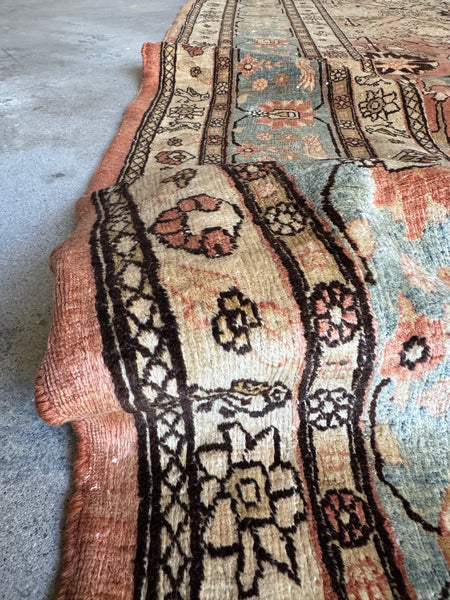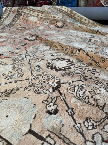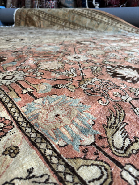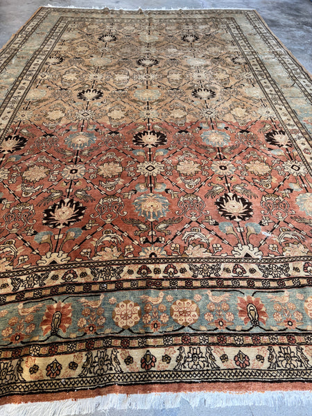 This antique Persian Tabriz rug brings serious color shift mania, thanks to natural abrash created by changes in dye batches during weaving. As the weaver worked through different lots of hand dyed wool, the ground color subtly shifts from warm and earthy to lighter and cooler tones, giving the rug depth, movement, and that unmistakable old rug character collectors love.