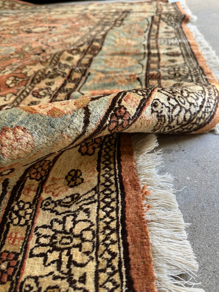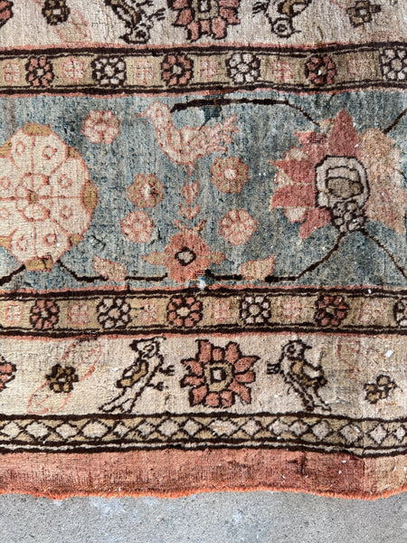 The design features a loose, lattice like interlaced floral pattern with birds thoughtfully scattered throughout the field, adding such charm and playfulness as well. This Persian feels lively but still is refined. The main border showcases a decorative botanical band filled with more bird motifs set against a soft blue ground, while an additional border layer introduces birds and florals on an ivory base, creating a beautiful sense of balance and framing.