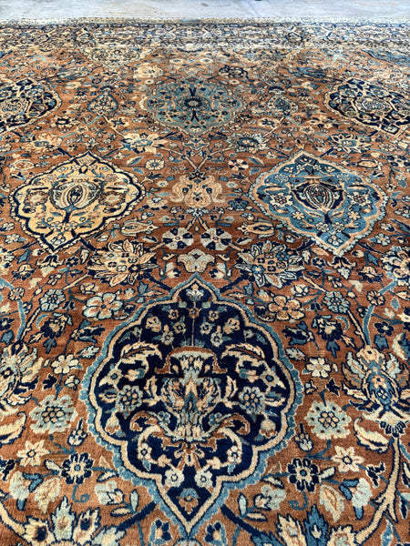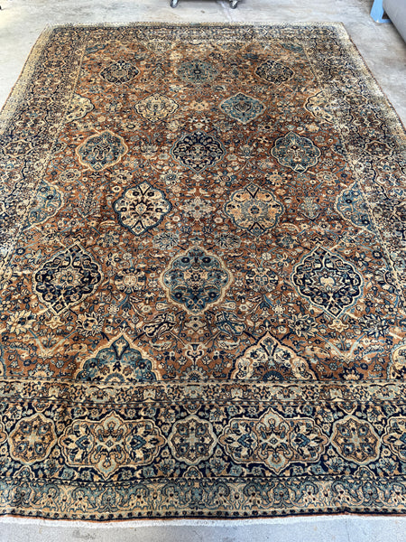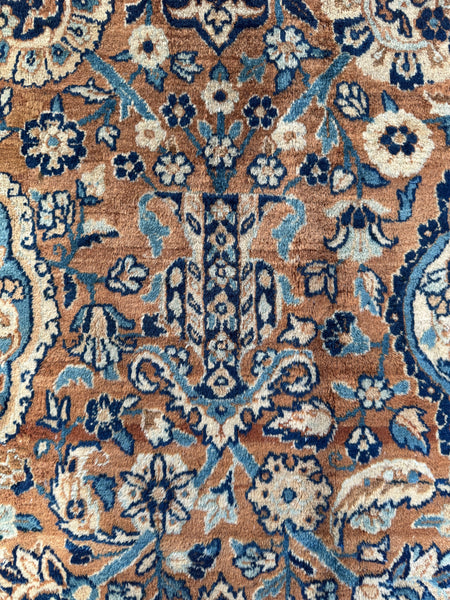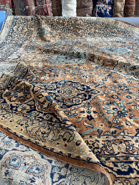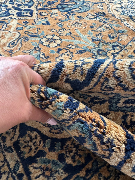 Approximately 10x14, this tightly woven 1920s Persian Kerman is a fine piece with an amazing color story that immediately pulls you in. The palette leans into warm camel, soft ivory, and layered blues that shift throughout the field…giving it depth without feeling heavy.