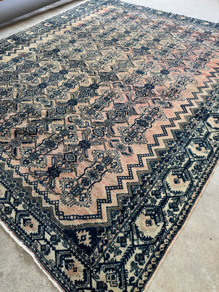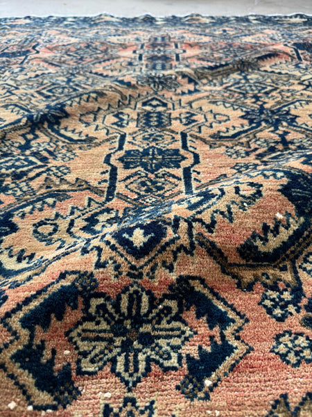 A really good one here…an antique 1920s Persian Malayer bringing that easy, lived-in magic. Sized at 9'8 x 11'4 and handwoven with vegetable dyed wool, it carries a sun-kissed blush ground that’s softened and shifted over time… exactly what you want to see from natural dyes doing their thing. The variation of abrash across the field is sensational, while those deep inky blues draws everything into focus.