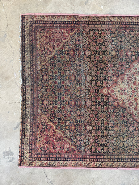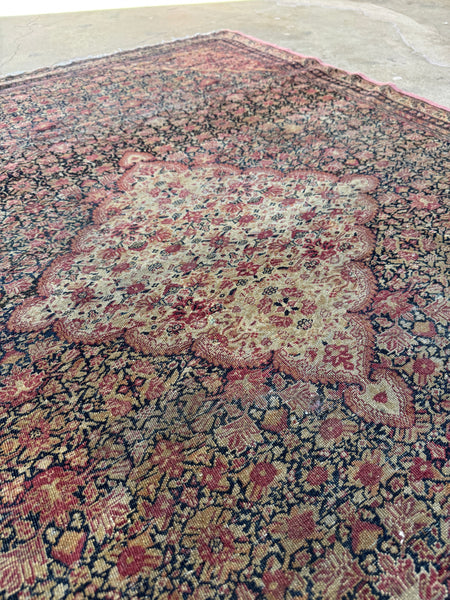 At the heart sits a sweet diamond medallion with floral details floating on an ivory ground, framed by corner spandrels that feel like a soft nod to old-world architecture. The rest of the main field is packed with a botanical pattern that lays against a midnight blue ground that keeps your eyes moving. Borders are slim and dainty so the main design gets all the attention it deserves.