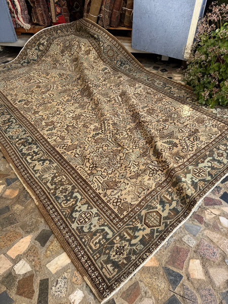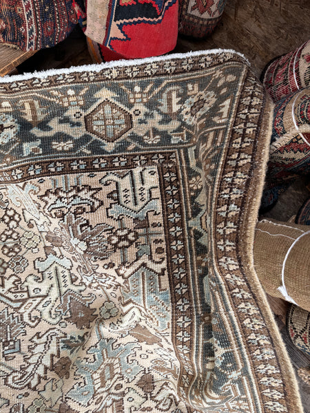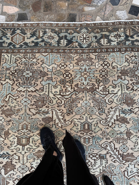 A grounded, easy-to-live-with Persian Heriz from the 1930s featuring the strong, angular tribal geometry that mountain weavers are known for. The ground color reads neutral sand with parchment tones and warm mineral undertones. Please see up close shots so you can sense the color of the field, it’s super faint, but quite present. Other colors include cacao, soft oxidized teal, earthy brown and walnut, baby blue, and ivory. This Persian has been softened through a compound wash that gently muted the original dyes to create a calm, versatile palette that pairs beautifully with both traditional and modern interiors.