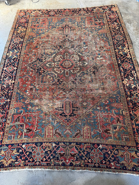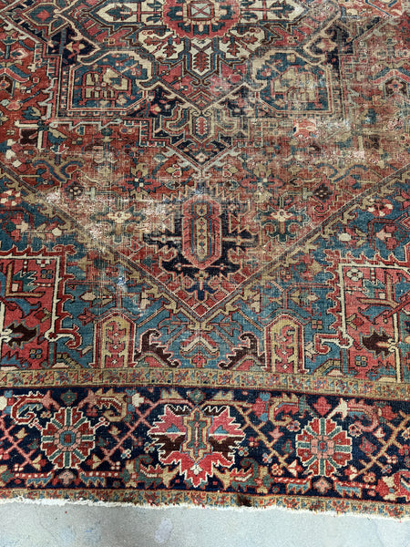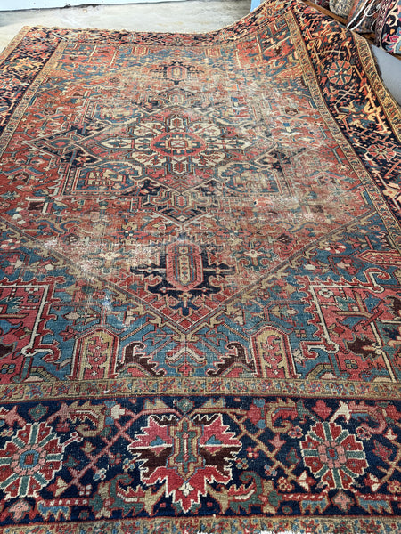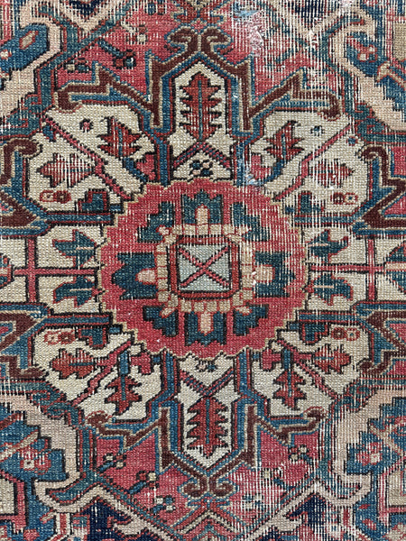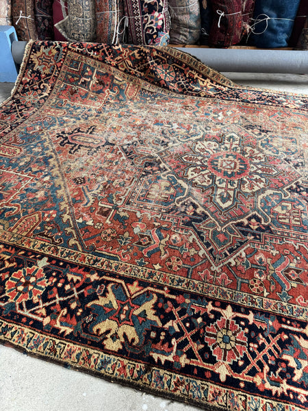 And let’s be real…she has lived. Like really lived. When she first landed with BPR, she was a battered old soul with threadbare zones, worn spots and areas begging for help. So, I called in my repair wizard. Together we gave her the TLC she has needed….reinforced spots, secured areas, and added some tiny patches pulled from another century-old Heriz remnant that generously “donated” its wool. Old helping old…my favorite kind of healing.
