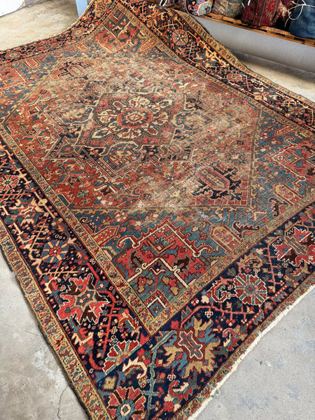 Handwoven circa 1920s in the Northwest mountains of Persia, this antique Persian Heriz rug is the definition of a lived-in legend. A brick red ground holds a powerful central medallion, surrounded by tribal art that just keeps unfolding the more you look. Spandrels in that beautiful French blue add extra charm, and the navy border is packed with turtle motifs doing their steady march around the perimeter.