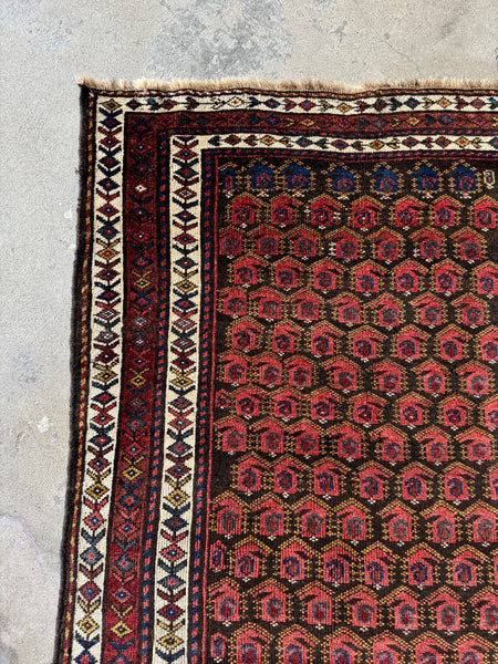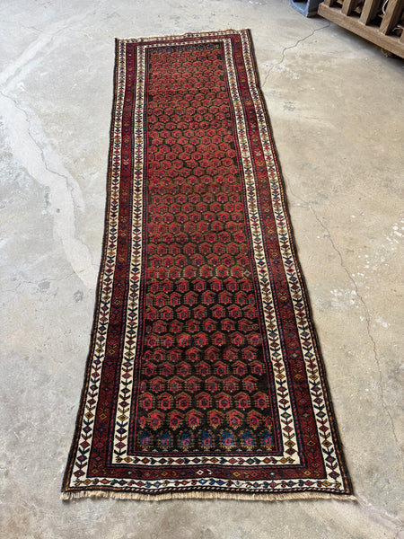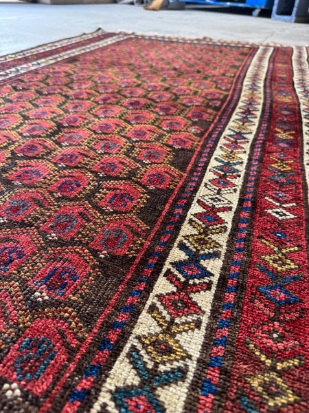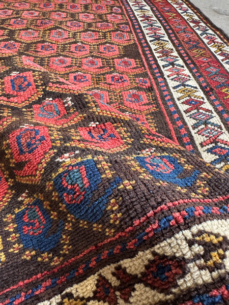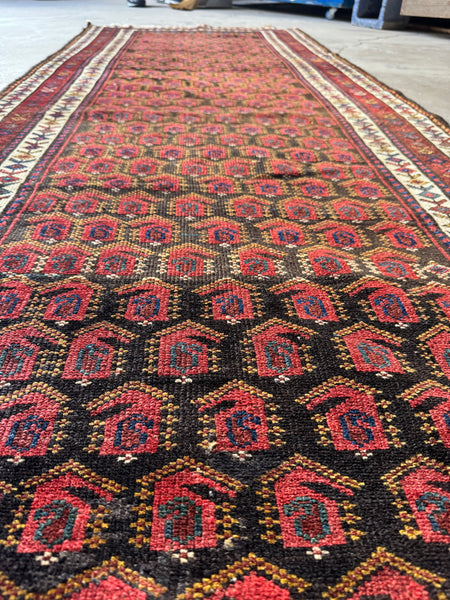 This antique Persian runner comes from the Kurdish tribe and dates to the late 19th century, a true old-world piece with serious personality. The field is filled with a linear, small-scale flame boteh pattern set against a deep chocolate brown ground, giving it a bold but grounded look. The botehs run in tidy rows, but like all good old rugs, there’s a bit of charming irregularity that reminds you it was made by human hands, not a machine.