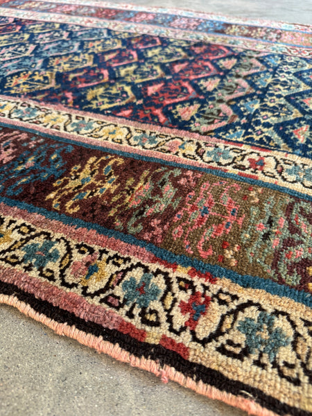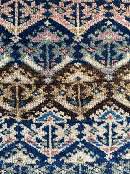 An antique 1920s Persian beauty with a lattice field full of stylized shrubs throughout…each little diamond shifting in tone as it travels. One end leans navy blue, the other melts into a deep coffee brown; weaver switched wool halfway through.