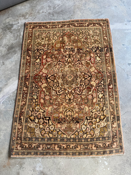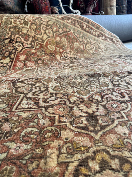 An exceptional antique Persian Tabriz from master weaver Haji Jalili… this small area rug is pure comfort for the eyes and the soul. Think of it as a warm hug in woven form. Known for pieces once made for royalty, Jalili’s work always brings elegance with purpose. The design here is curvilinear, featuring a medallion within a medallion within a medallion, with layers of detail that keep you staring.