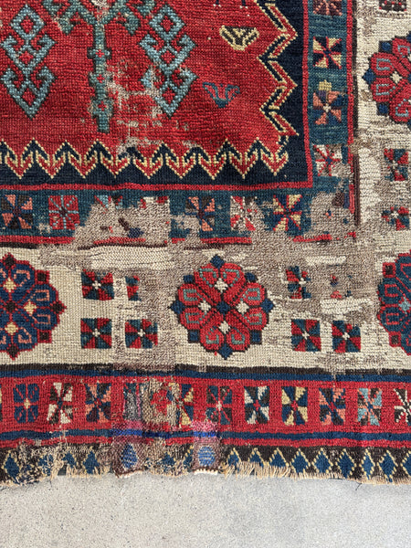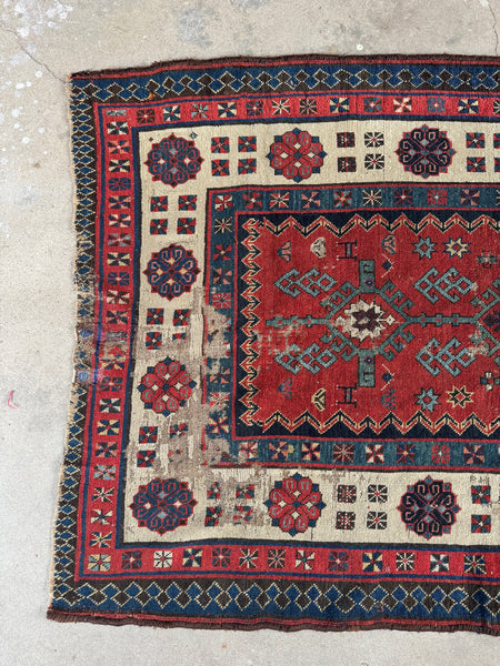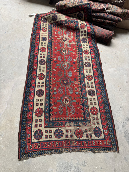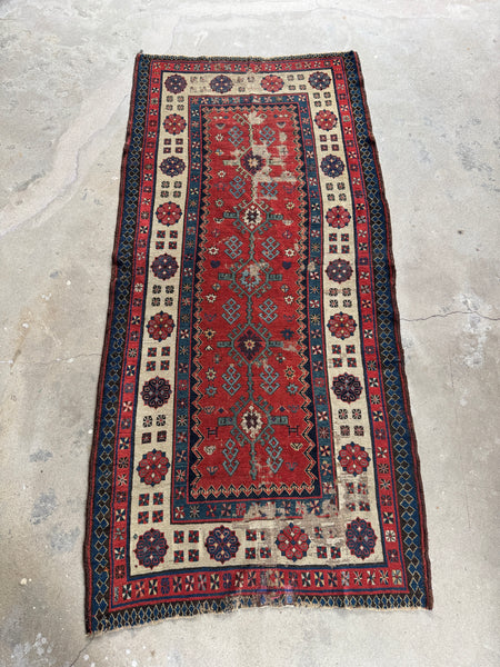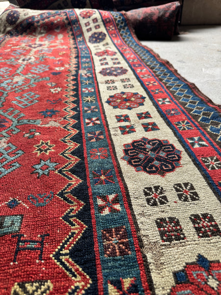 Handwoven from 100% vegetable dyed wool, the colors remain rich and grounded, showing the depth that only natural dyes and old world wool can produce. Because of its age and wear, this runner is best suited for lighter use spaces where its remarkable history can be appreciated rather than subjected to heavy everyday traffic. A true piece of Caucasian weaving heritage…full of stories, strength, and unmistakable presence.