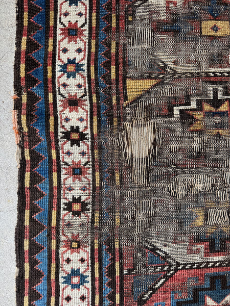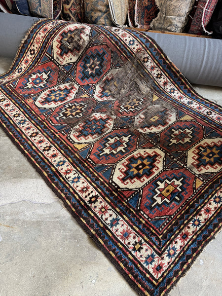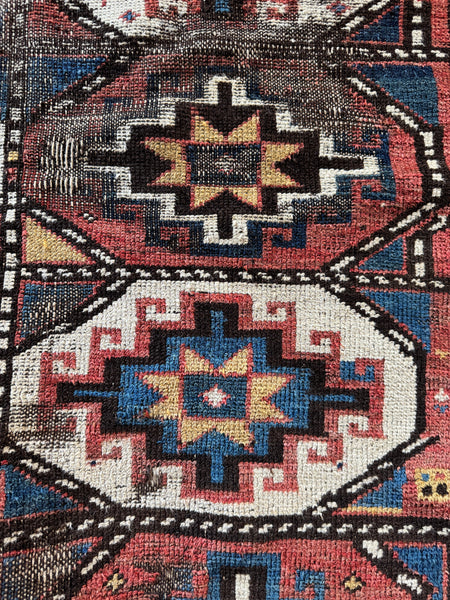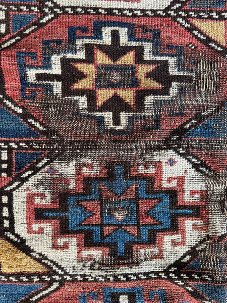 For those who appreciate their rugs with a little grit and a lot of soul…this distressed antique1880s Kazak from the weavers of the Caucasus absolutely delivers. Kazak rugs are known for their powerful tribal designs, bold drawing, and sturdy construction, traditionally handwoven with vegetable dyed wool by village and tribal weavers throughout the Caucasus mountains.