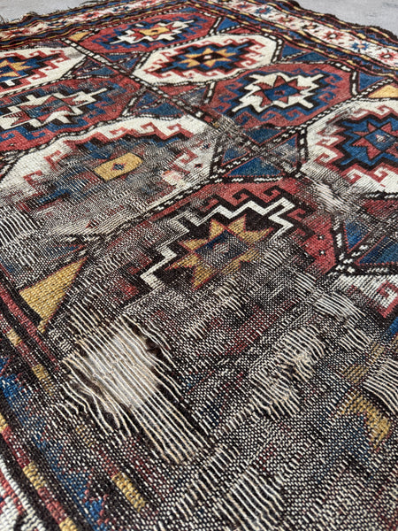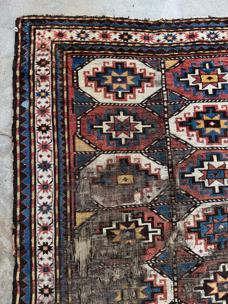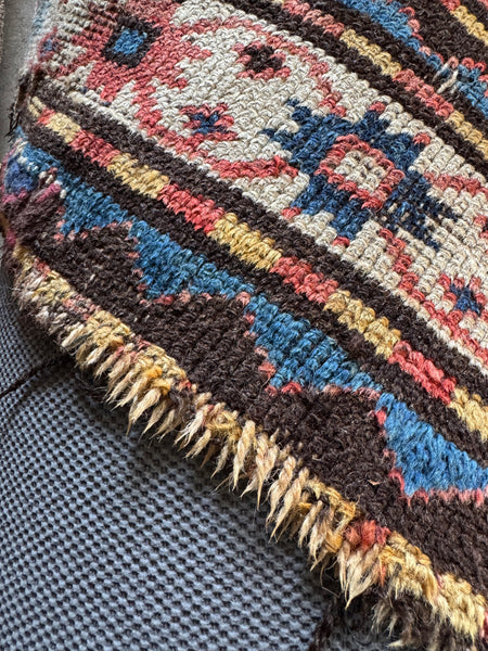 The design still holds strong with its tribal geometry and confident drawing. Even with the wear, the colors continue to show through with warmth and depth, giving the rug that unmistakable old-world presence. This is not a rug for someone looking for perfection. It’s for someone who appreciates history, texture, and the true life lived of a handmade piece. A wonderful choice for wall display, low-traffic spaces, or interiors where a beautifully worn antique rug is exactly the look. Full of character. Completely one of a kind.