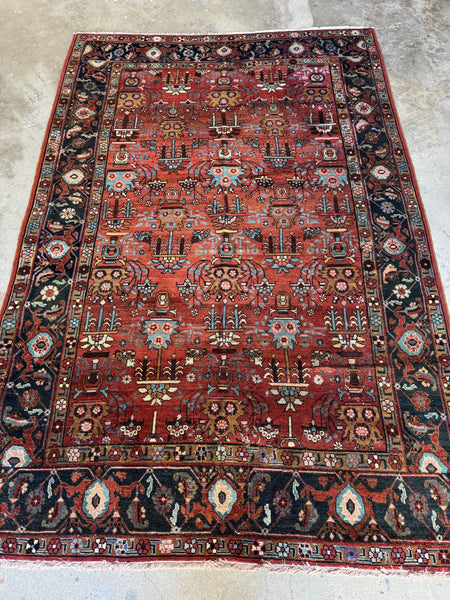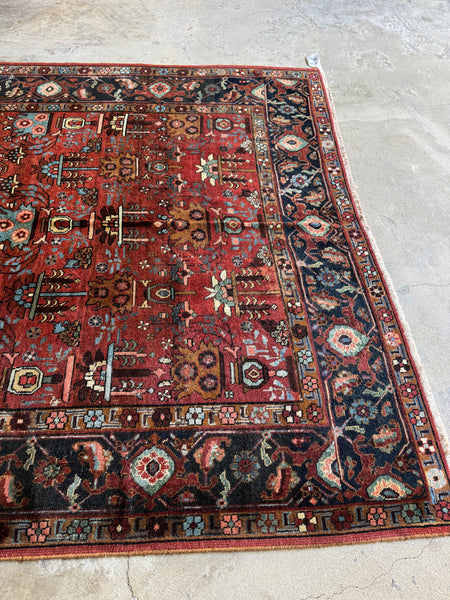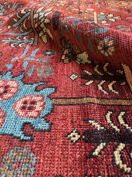 Early 1900s Persian Heriz from the mountainous Northwest region, handwoven with vegetable dyed wool. The field features linear rows of wild and decorative botanical motifs that float across a terracotta red ground kissed with rust undertones. The design feels alive, filled with unexpected rhythm and painterly contrast, especially with those bold shocks of aquamarine blue that punctuate the pattern throughout.