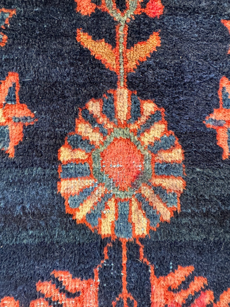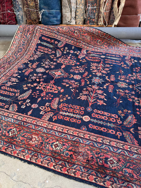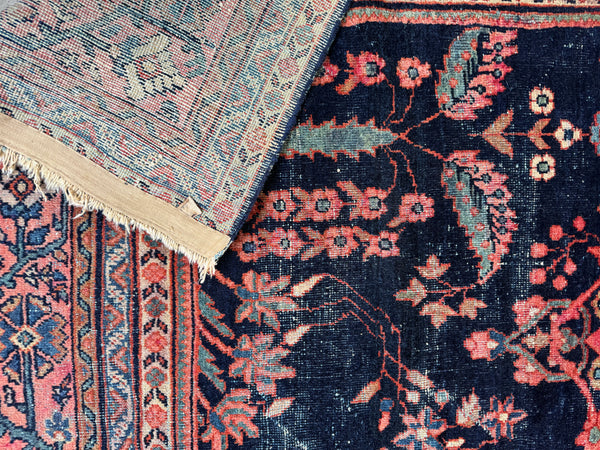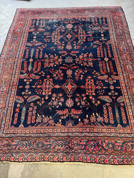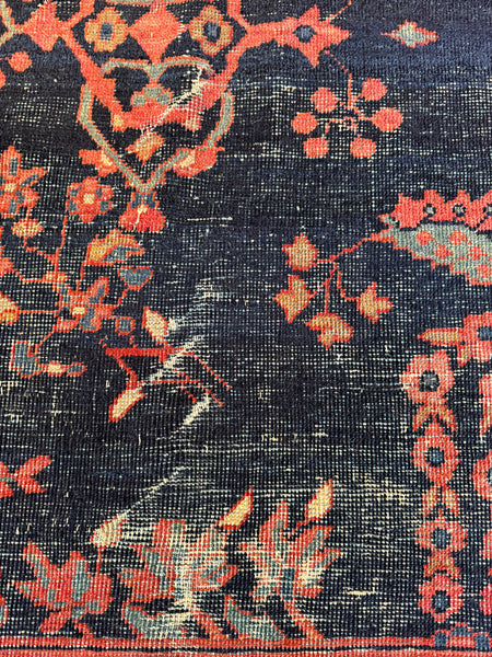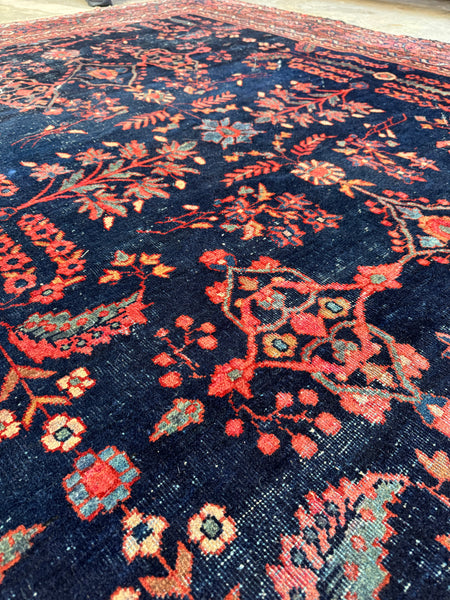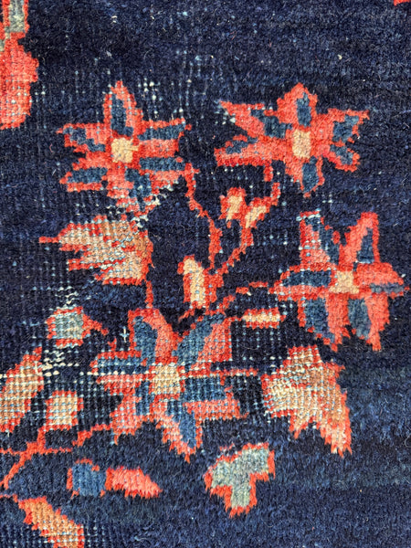 From a Northwest Persian village called Mahal, this 1920s piece has a ground field royal navy blue, a color we love and celebrate in the antique rug world.