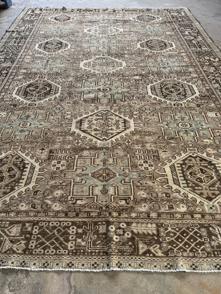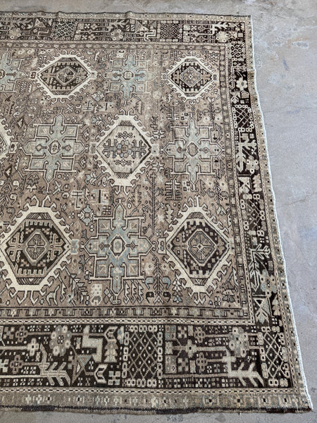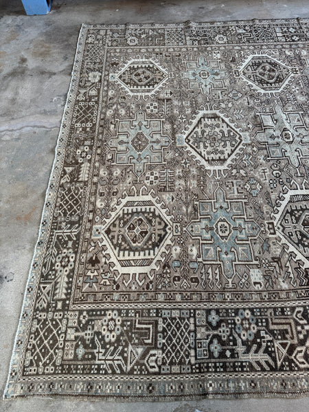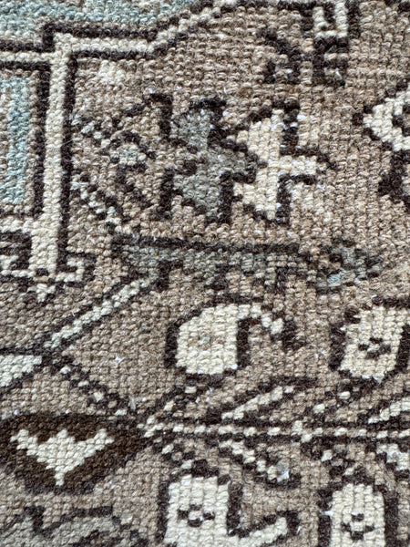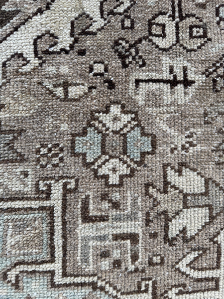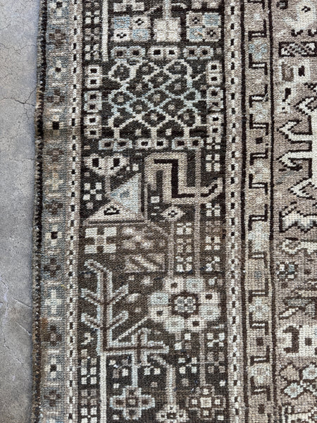 Woven circa 1930 in the rugged mountains of NW Persia, the wool of this rug is coarse and durable and has simple and warm color ways. This beauty features a warm oatmeal ground with espresso, antique ivory, tan and various shades of subtle, sweet pops of ice blue. It is low pile and super clean, with sides fully bound and the top and bottoms secured. In great condition! This Persian was given a compound wash that has given it the subdued colors that you see. Priced at a steal for amazing art and an old rug in great demand. Thanks for shopping small.