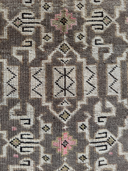 This is a soulful little scatter rug woven by tribal weavers of the Caucasus Mountains, dating back to the first quarter of the 20th century. A beautifully neutral piece with a soft khaki two-tone field, gently accented by muted tangerine borders and touches of dusty blush pink that peek through the tribal motifs. This little is subtle, earthy, and incredibly easy to live with.