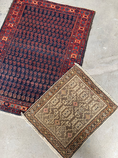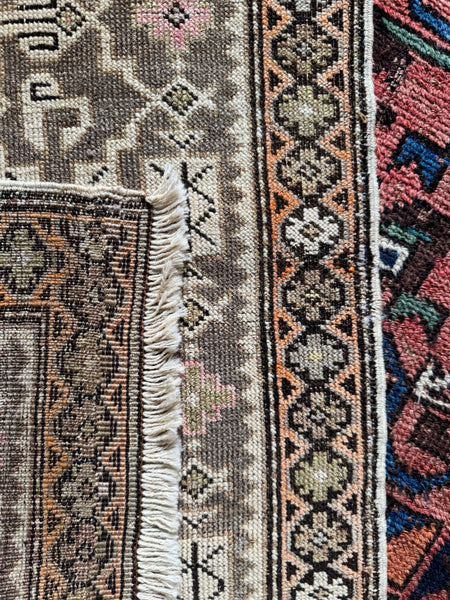 Its shape is rectangular, though like all old handmade rugs, it carries a slight natural curvature along the edges…a quiet reminder that human hands brought it to life a century ago.