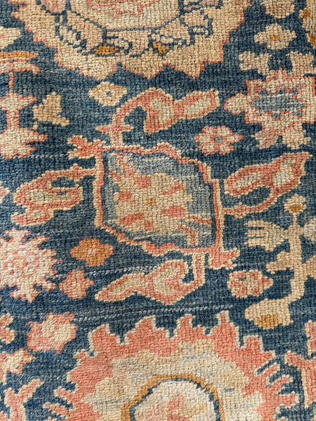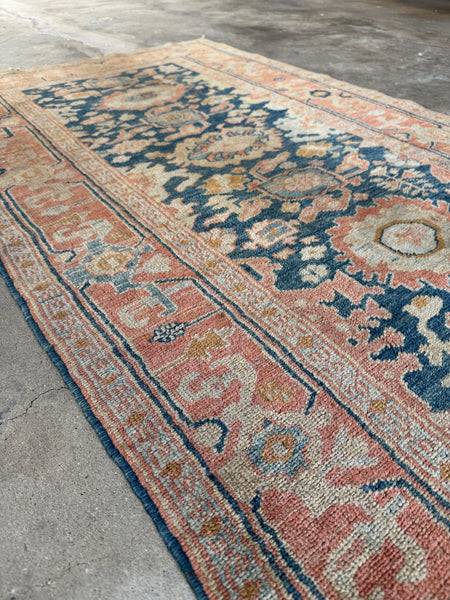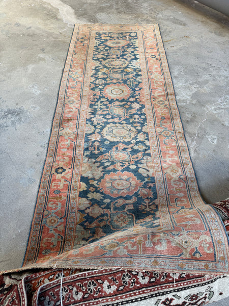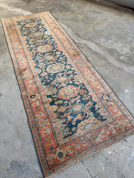 This skinny antique Persian runner dates to the late 19th century and stands out immediately for its quietly unusual color story. The field reads like a soft, dusty denim blue…not sharp or inky, layered with mellow apricot, soft coral, sand, and gentle earthy notes that feel completely settled. The palette is out of the norm for Persian runners, especially from this era, and has a natural calm presence that works beautifully in both classic and more relaxed spaces.