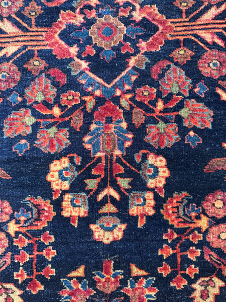 Low pile from a century of life, yet stout and steady underfoot with that satisfying, substantial handle Sarouks are famous for. Vegetable dyed wool, saturated navy and ember reds with hints of teal and gold that still sing. Worn in the right ways…polished, soulful, easy to style anywhere a dose of old world floral is needed. Worn but still durable.