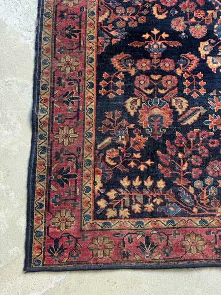 Aged beauty with backbone…a 1920s Persian Sarouk on a deep midnight ground, strewn with blossoming sprays and leafy tendrils that rise from a central bouquet and drift to the corners. The madder border marches with rosettes and tiny buds…a classic garden frame around a moody field.