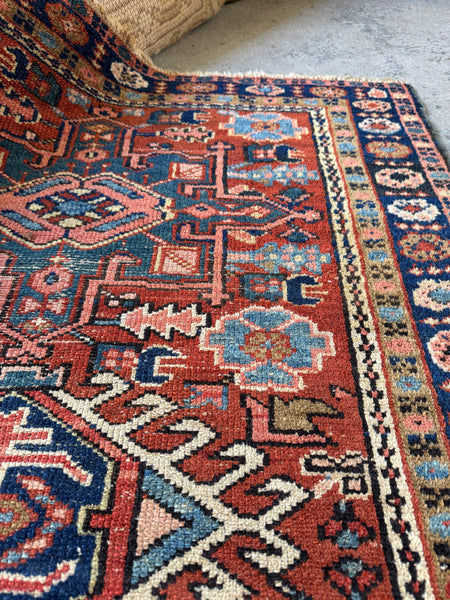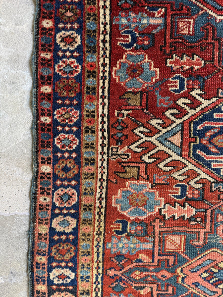 The design is graphic and grounded, with strong geometric motifs that feel architectural and intentional. A warm brick red field anchors the rug, layered with deep navy, soft ivory, muted aqua blues, and earthy accents that have mellowed beautifully with age. The borders are bold and rhythmic, framing the center with classic Heriz energy without feeling fussy.