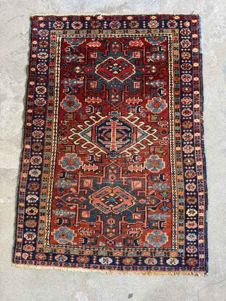 This small 1930s Persian Gharajeh rug packs everything these weavings are known for into a compact footprint…strength, bold design, and a whole lot of confidence. Handwoven with vegetable dyed wool, it has that unmistakable Heriz construction…firm, weighty, and built to handle real life.