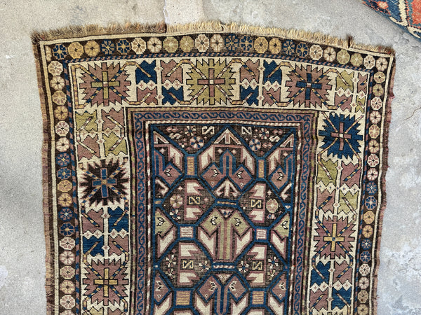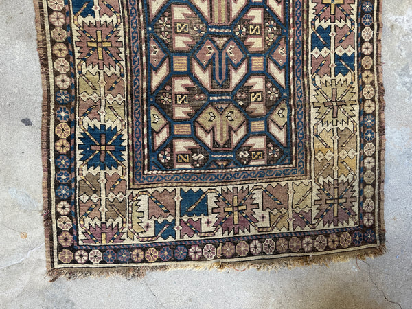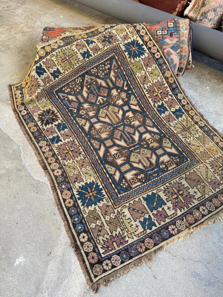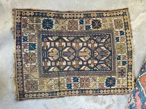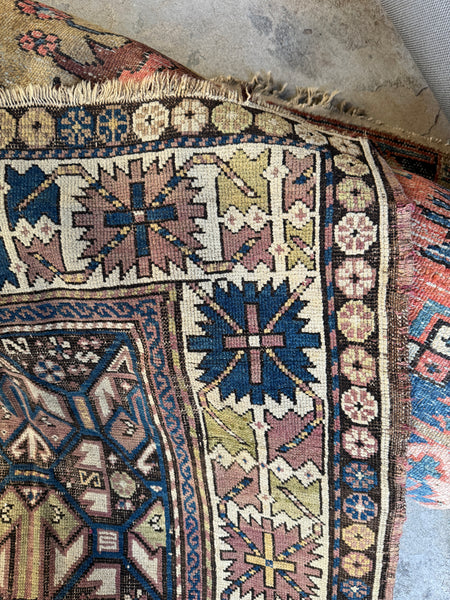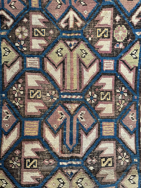 Woven in the third quarter of the 19th century, this antique Caucasian rug comes straight from the high mountain weaving traditions where symbolism, geometry, and durability mattered as much as beauty. The field is anchored by a bold, graphic medallion surrounded by powerful tribal motifs…each element placed with intention rather than perfection, which is exactly what gives this piece its soul.