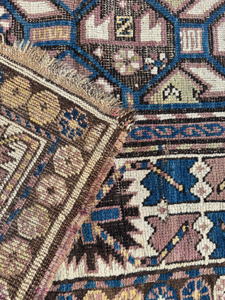 What really sets this rug apart is the color story. Soft lilac and faint eggplant tones weave through warm earth hues, indigo blues, and muted lime green…a palette that feels quietly complex and incredibly hard to come by. These are true vegetable dyes that have softened and settled over time, creating that mellow, slightly dusty patina collectors love.