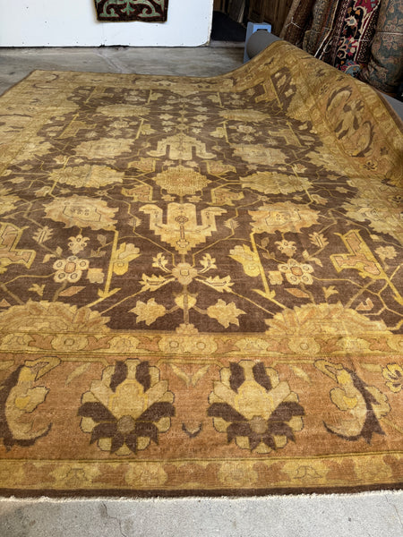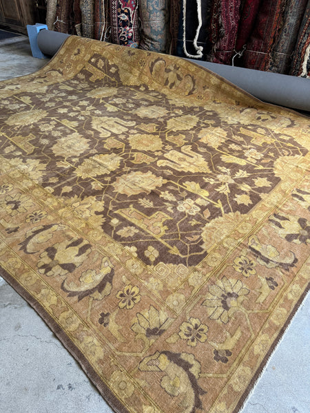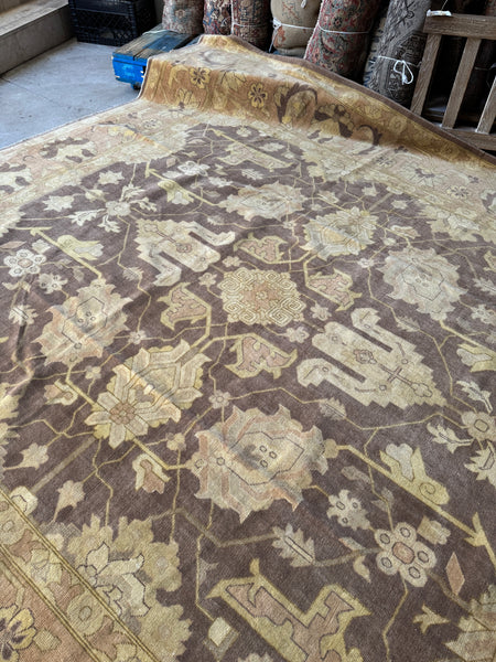 Color-wise, this one is a shapeshifter. In warm light it leans cozy and golden. In cooler spaces, it pulls slightly ashy and more neutral. Think cocoa, latte foam, and faded parchment with hints of mossy gold tucked into the pattern. A great grounding piece for a big room, especially when you want texture, history, and zero fussiness. Depending on lighting and angle, the rug will appear warmer or cooler.