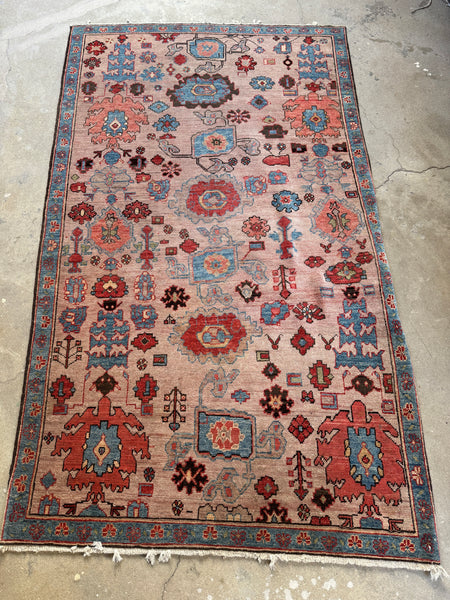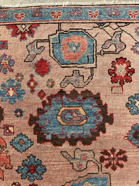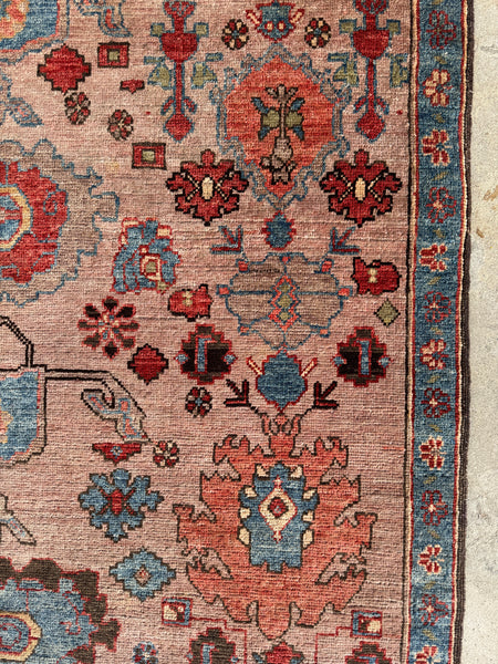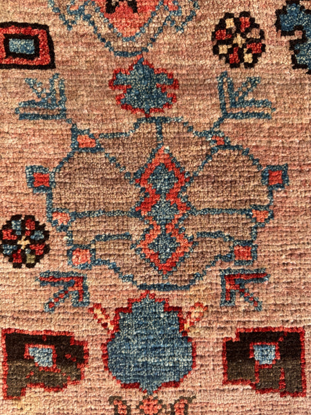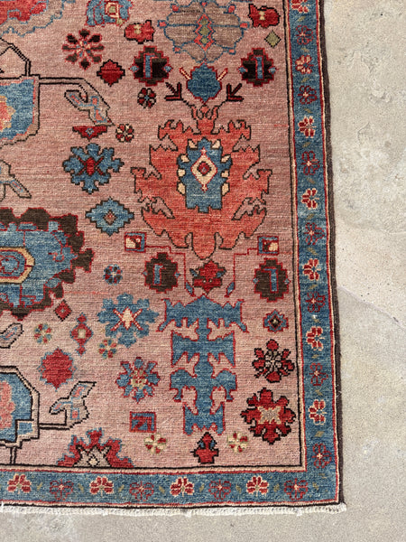 Handwoven with vegetable dyed wool, the palette is a vibe… coral, rhubarb, aqua blue, and French blue giving it a punchy twist while still feeling grounded and warm. A dainty floral border frames it all in a sweet, classic Heriz way.